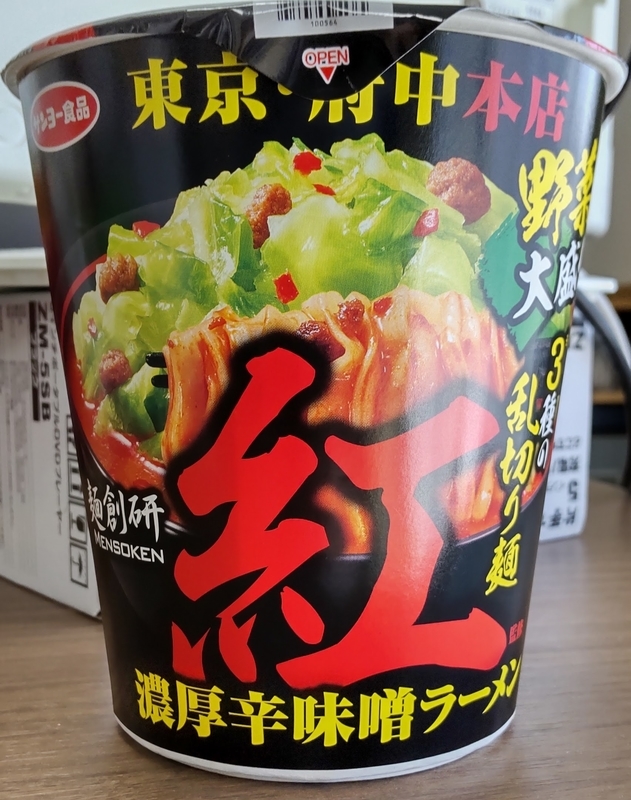 サンヨー食品 麺創研 紅 東京府中本店 濃厚辛味噌ラーメン 110g 475kcal 食べてみた! 見た目は「辛い系」x「二郎系」?という印象のパッケージ。